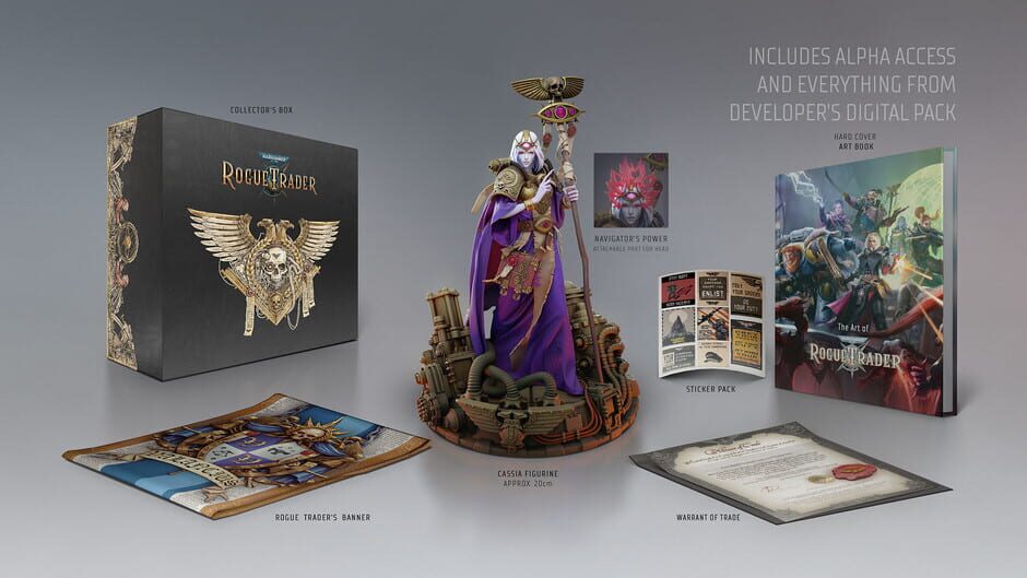 This fabulous collector’s box includes an 8-inch\20cm Cassia painted figure, hardcover art book, Warrant of Trade that you can personalize with your name, Rogue Trader banner, and sticker pack. As well, all the items included in the Developer’s Digital Pack.